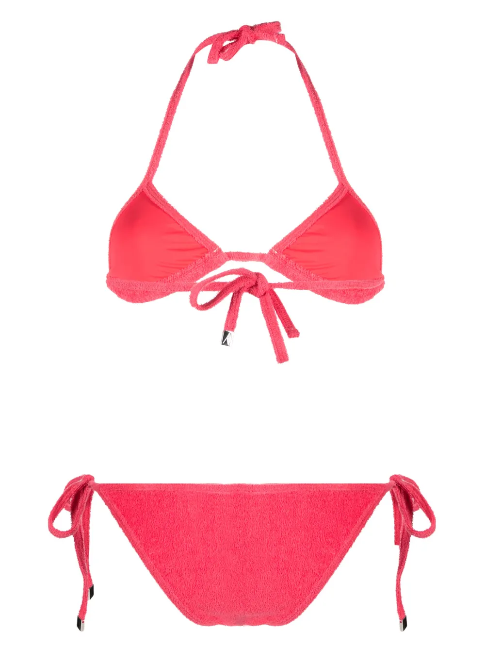 Badstof effect, triangel cup, halternek striksluiting, striksluiting aan de achterkant en bikinislip met striksluiting aan de zijkant. Zwemkleding moet over je eigen kleding worden aangepast..