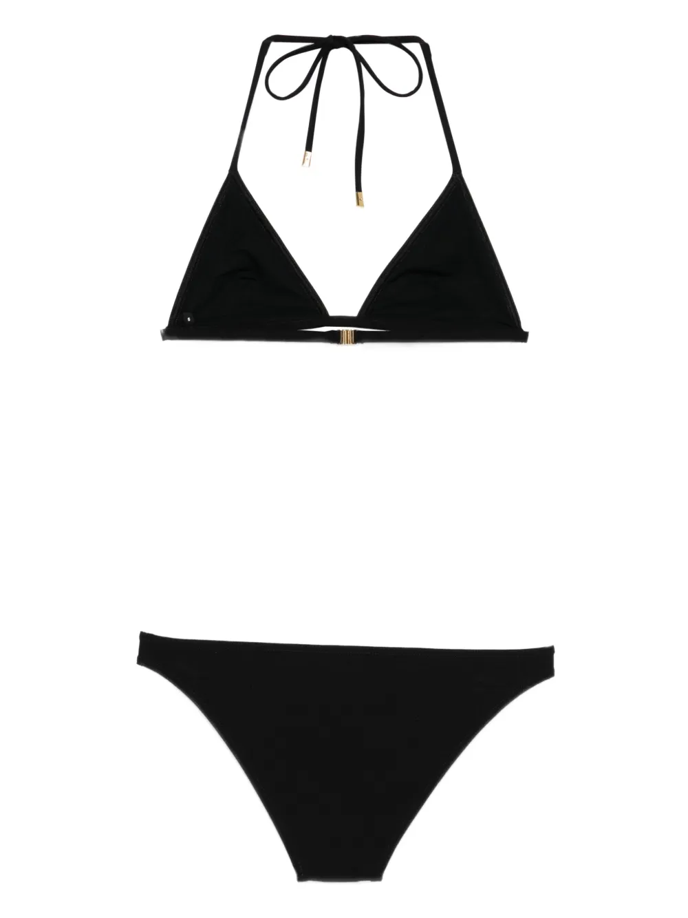 zwart triangelvormige top halternek striksluiting goudkleurige hardware Zwemkleding moet over je eigen kleding worden aangepast.
