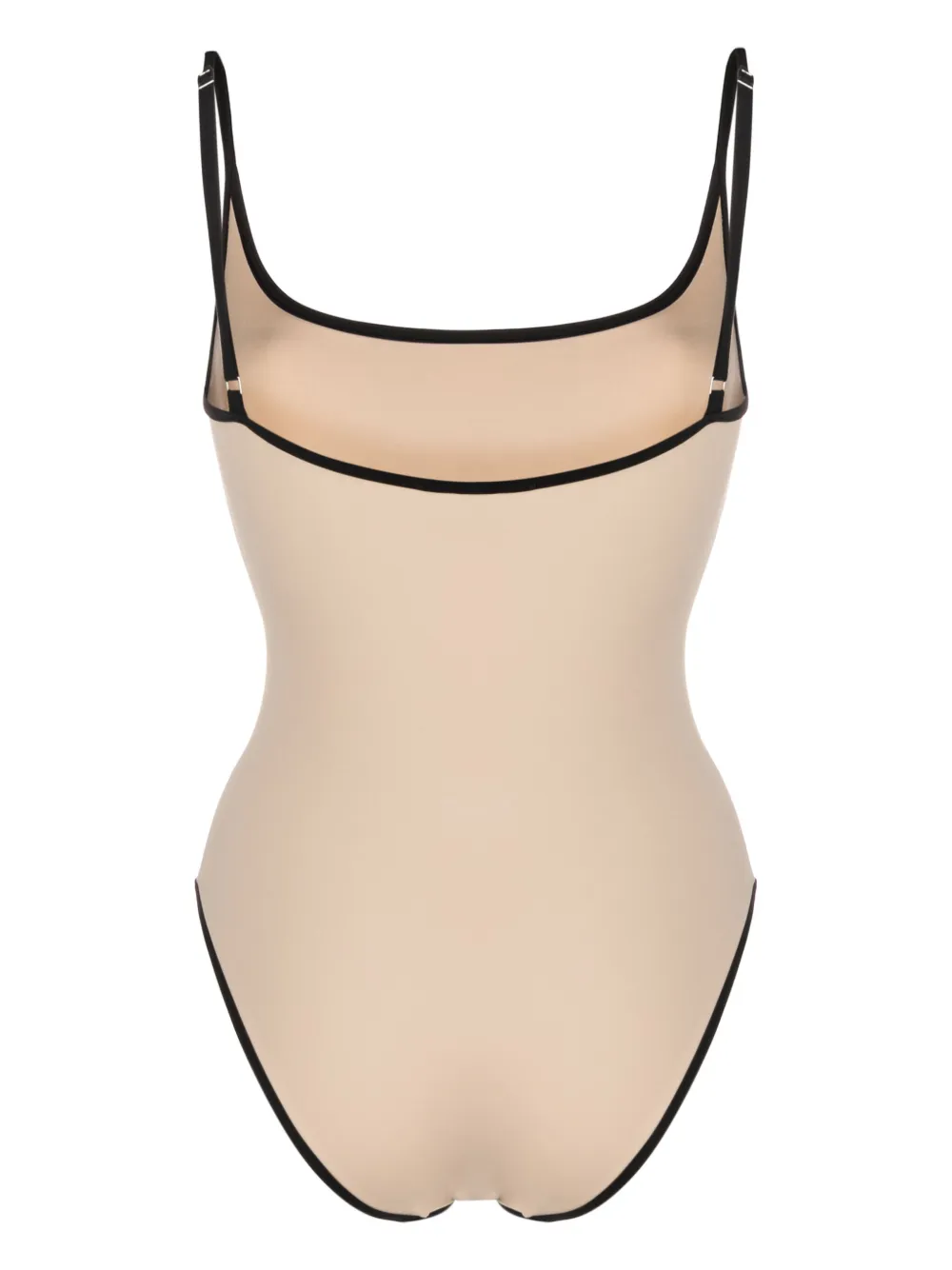 Licht beige, zwart, contrasterende afwerking, ronde hals, verstelbare schouderbandjes en hoog uitgesneden. Zwemkleding moet over je eigen kleding worden aangepast..