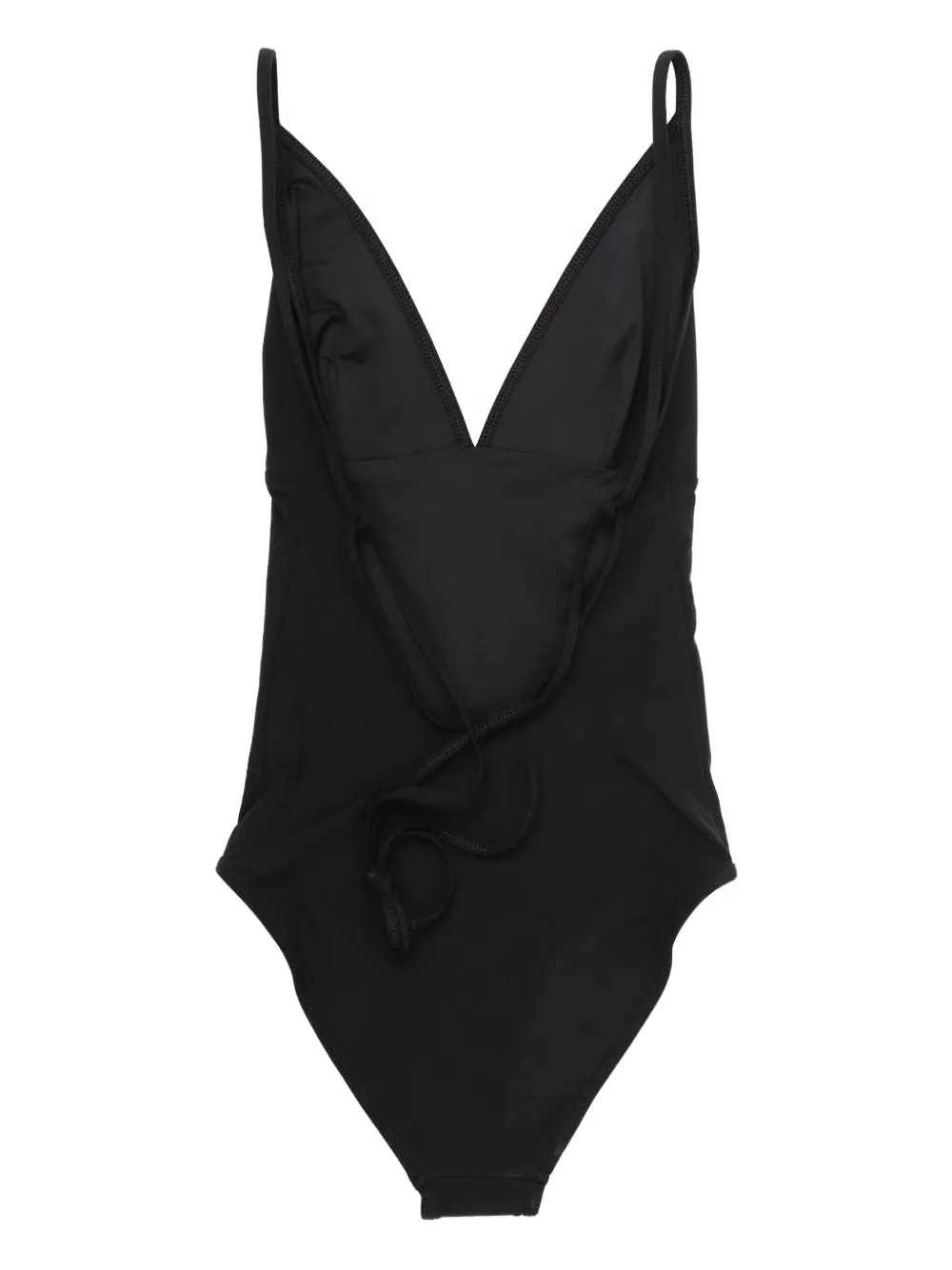 zwart V-hals striksluiting lage rug smalle bandjes Zwemkleding moet over je eigen kleding worden aangepast.