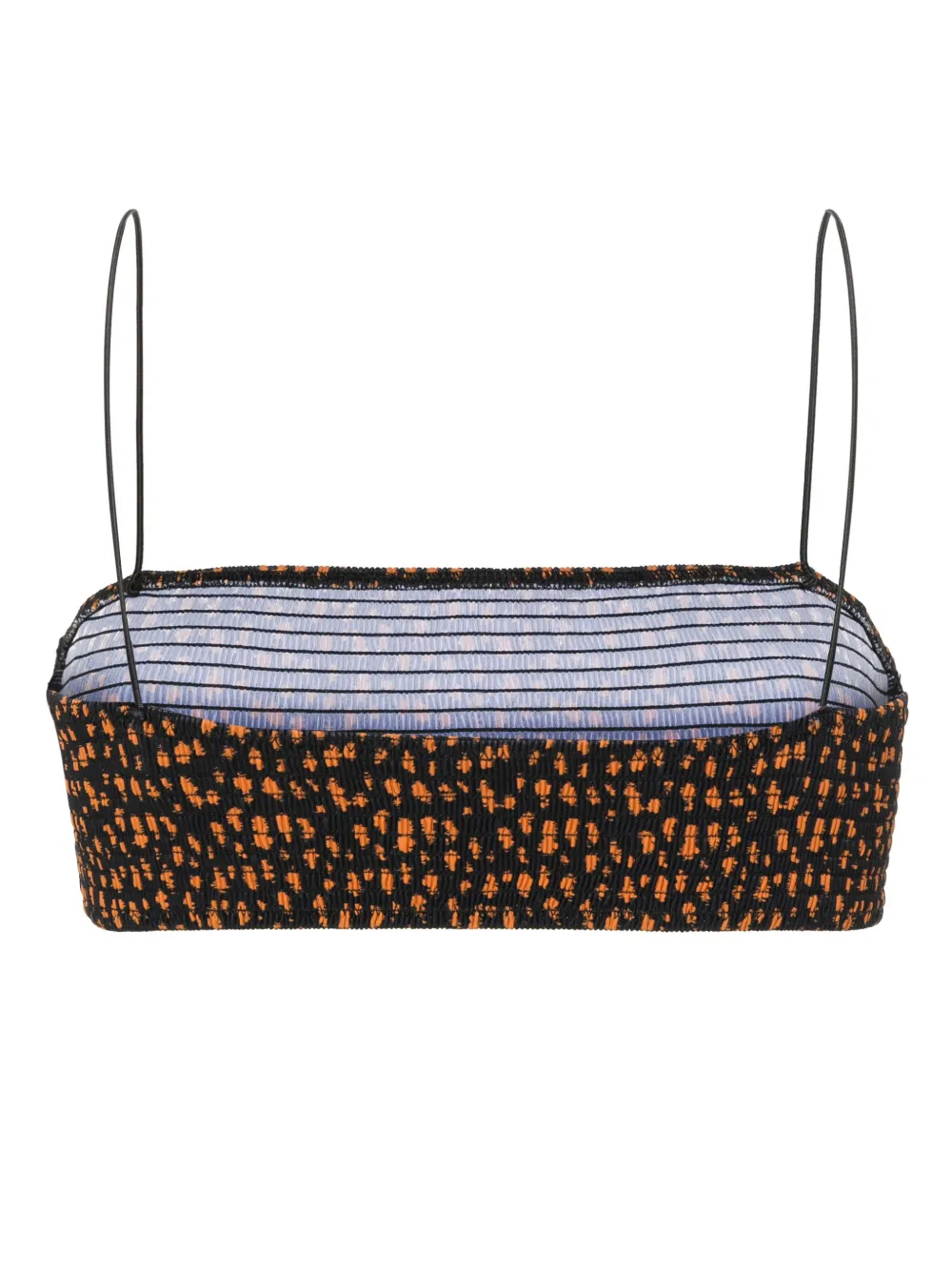 terracottaoranje gerimpeld effect abstract patroon spaghettibandjes vierkante hals bandeau Zwemkleding moet over je eigen kleding worden aangepast.