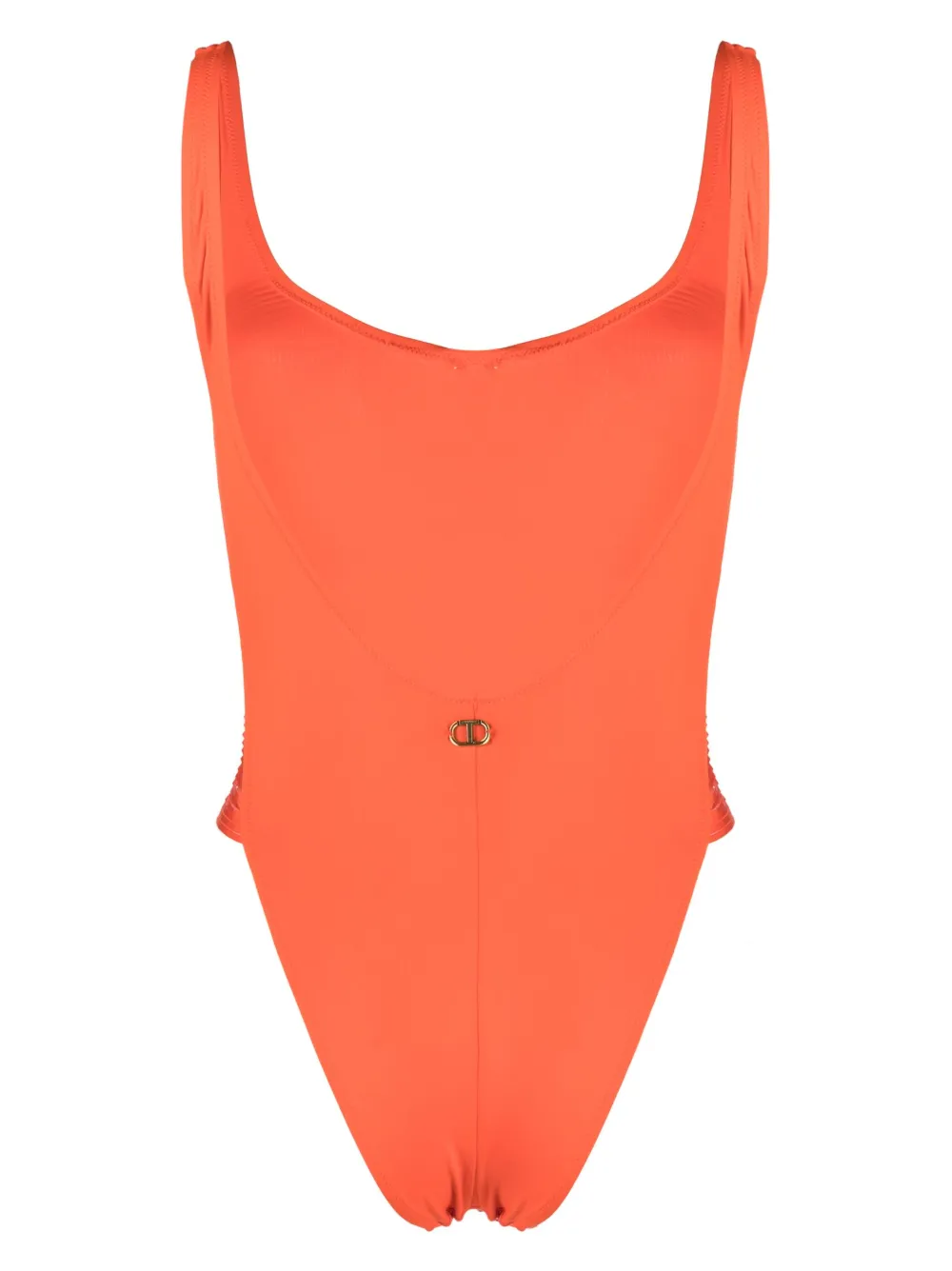 Worteloranje, stretch design, goudkleurig logo, banddetail, uitgesneden detail , U-hals, mouwloos en laag uitgesneden rug. Zwemkleding moet over je eigen kleding worden aangepast..