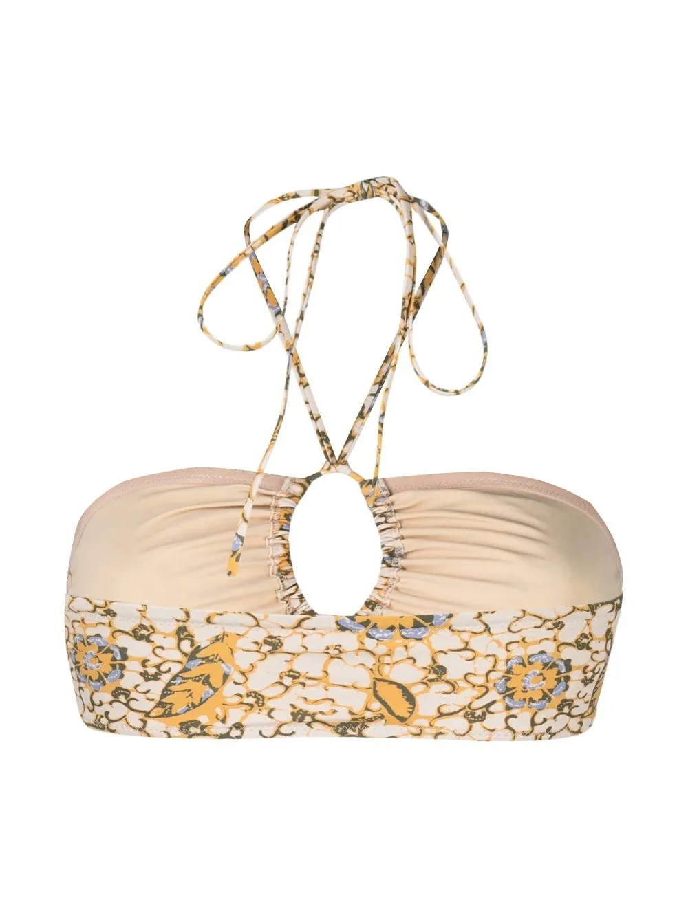 Beige, geel, halternek striksluiting en uitgesneden detail . Zwemkleding moet over je eigen kleding worden aangepast..