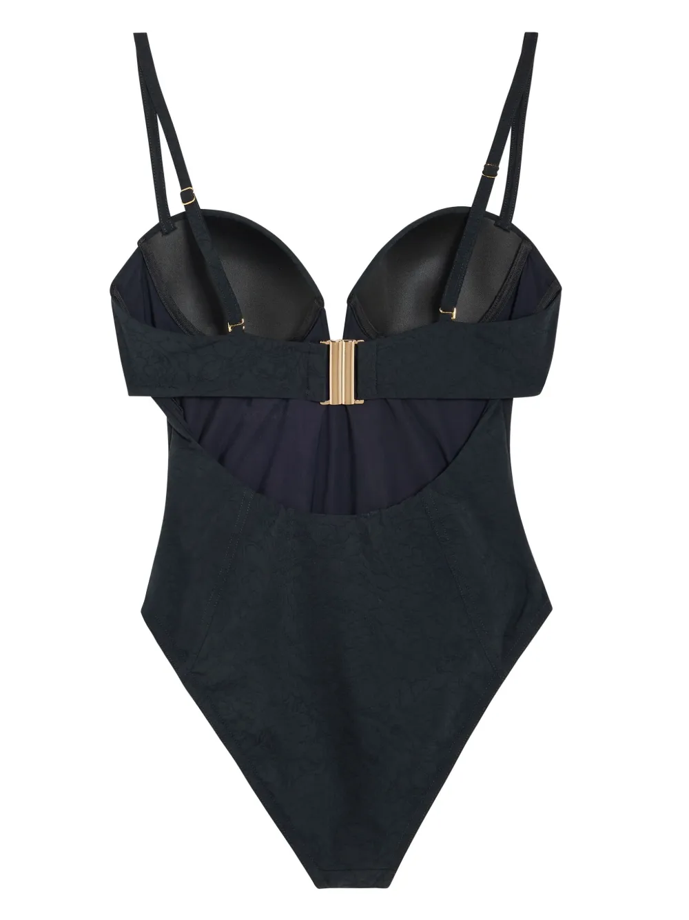 zwart jacquard met patroon Medusa detail goudkleurige hardware stretch design sweetheart-hals haaksluiting aan de achterkant verstelbare spaghettibandjes Zwemkleding moet over je eigen kleding worden aangepast.