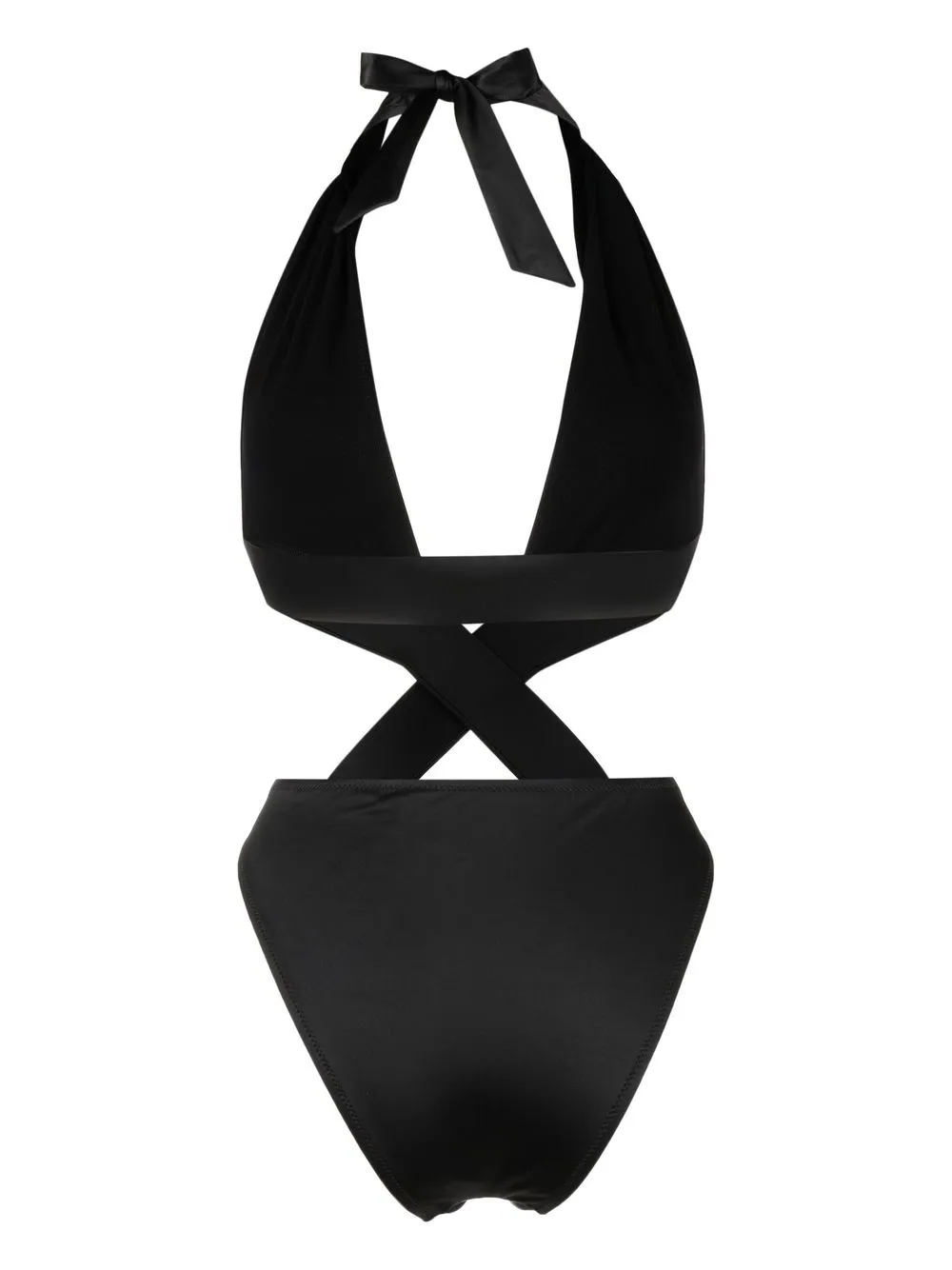 Zwart, Medusa patroon, plunge stijl, gekruiste band en striksluiting aan de achterkant. Zwemkleding moet over je eigen kleding worden aangepast..