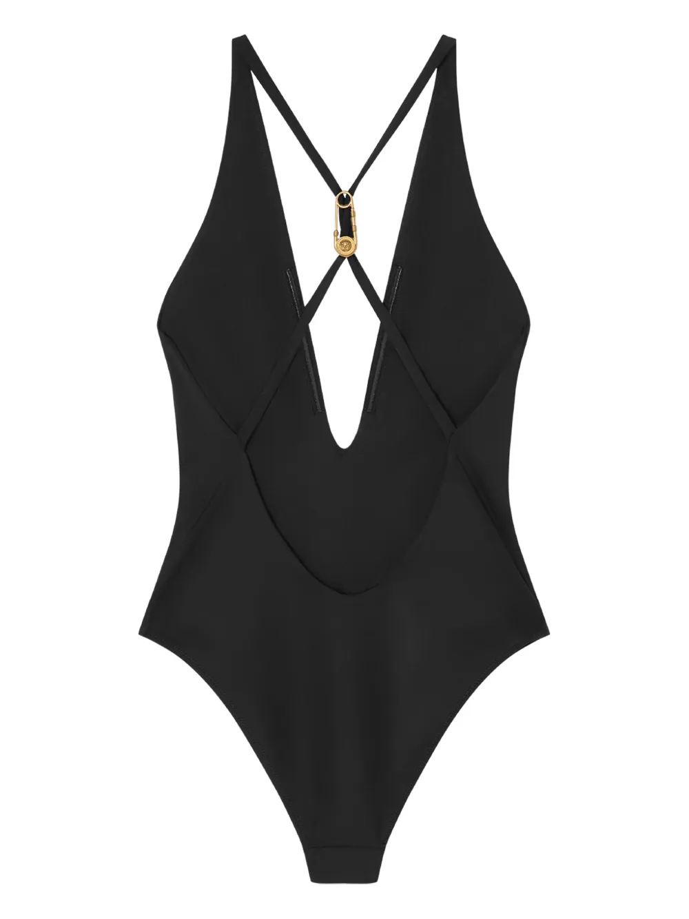 zwart V-hals veiligheidsspeld detail mouwloos gekruiste bandjes aan de achterkant Zwemkleding moet over je eigen kleding worden aangepast.