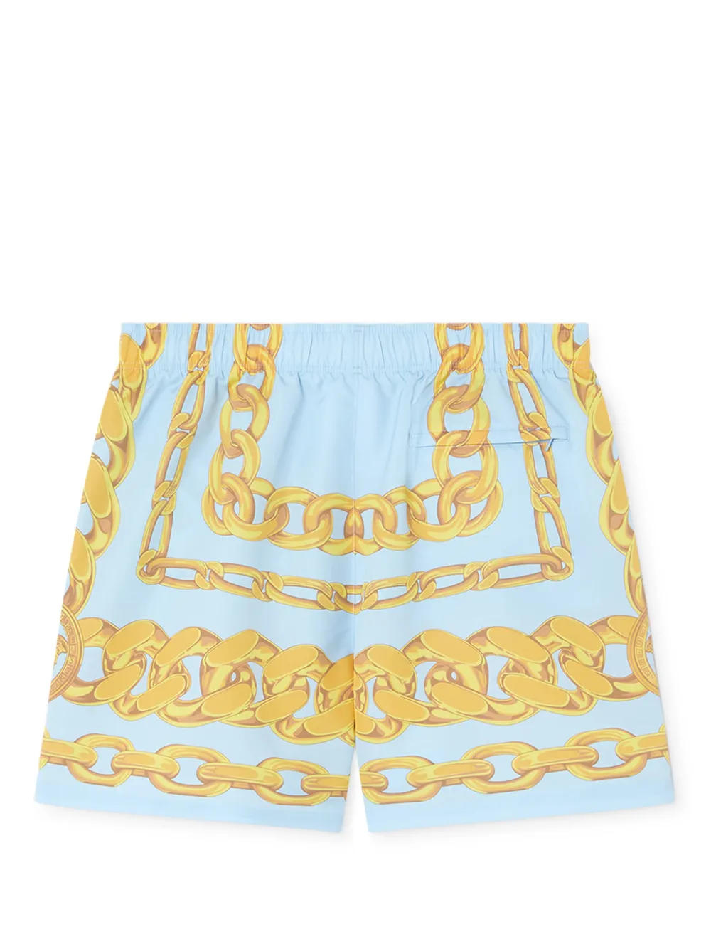 lichtroze/zonnebloemgeel schakelkettingprint elastische tailleband met trekkoord twee steekzakken aan de zijkant achterzak met ritssluiting Zwemkleding moet over je eigen kleding worden aangepast.