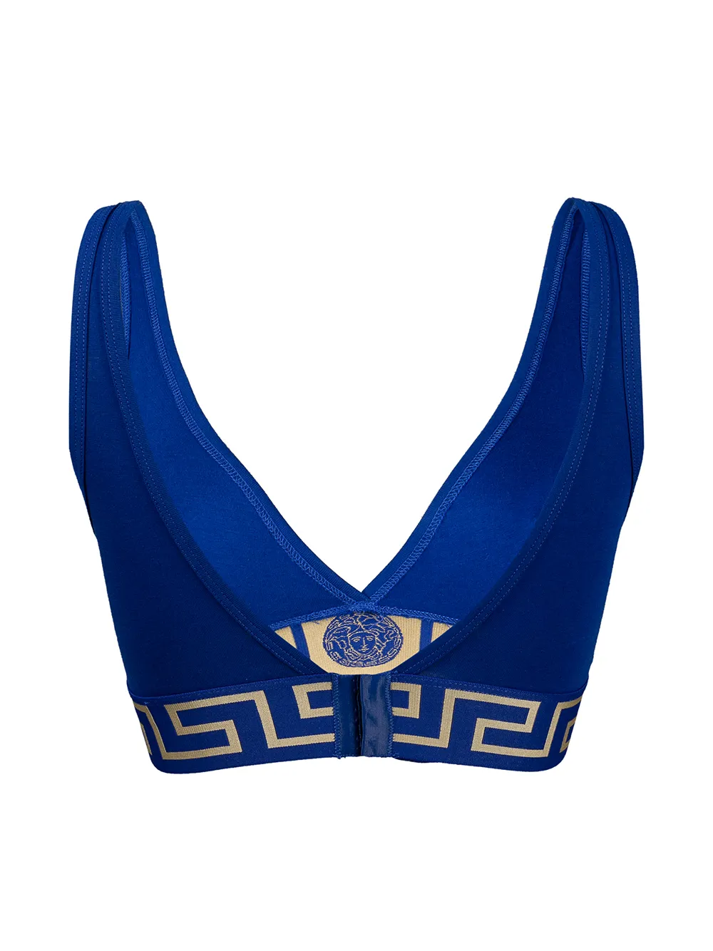 koningsblauw/goudkleurig katoenblend kenmerkende Greca details Medusa patroon V-hals sluiting aan de achterkant Zwemkleding moet over je eigen kleding worden aangepast.