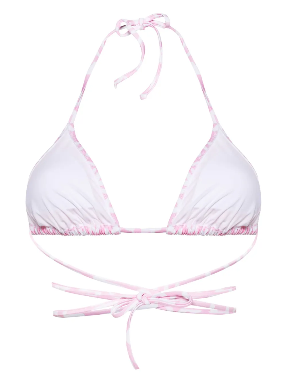 roze/wit stretch design allover logoprint triangel cup halternek striksluiting striksluiting aan de achterkant rechte open rug elastische band Zwemkleding moet over je eigen kleding worden aangepast.