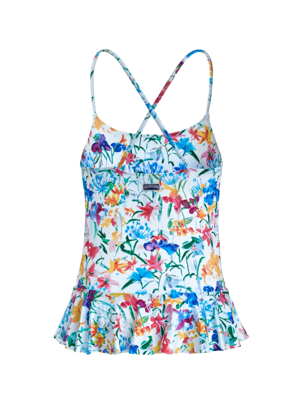 wit/veelkleurig gerecycled polyamide bloemenprint vierkante hals spaghettibandjes gekruiste bandjes aan de achterkant flared rok Zwemkleding moet over je eigen kleding worden aangepast.