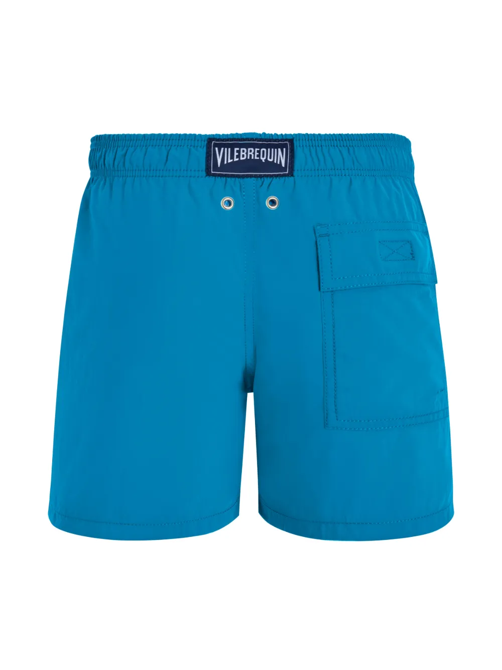 oceaanblauw gerecycled polyester logopatch elastische tailleband met trekkoord klepzak achter lengte tot boven de knie Zwemkleding moet over je eigen kleding worden aangepast.