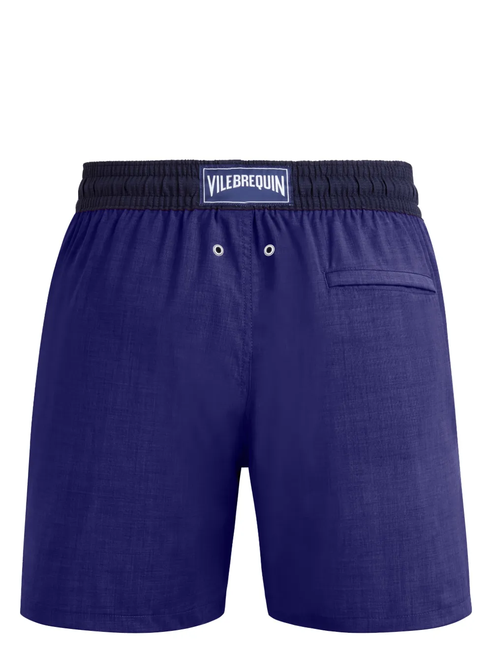 blauw tweekleurig design logo applicatie ringlets detail elastische tailleband met trekkoord rechte pijpen paspelzak aan de achterkant Zwemkleding moet over je eigen kleding worden aangepast.