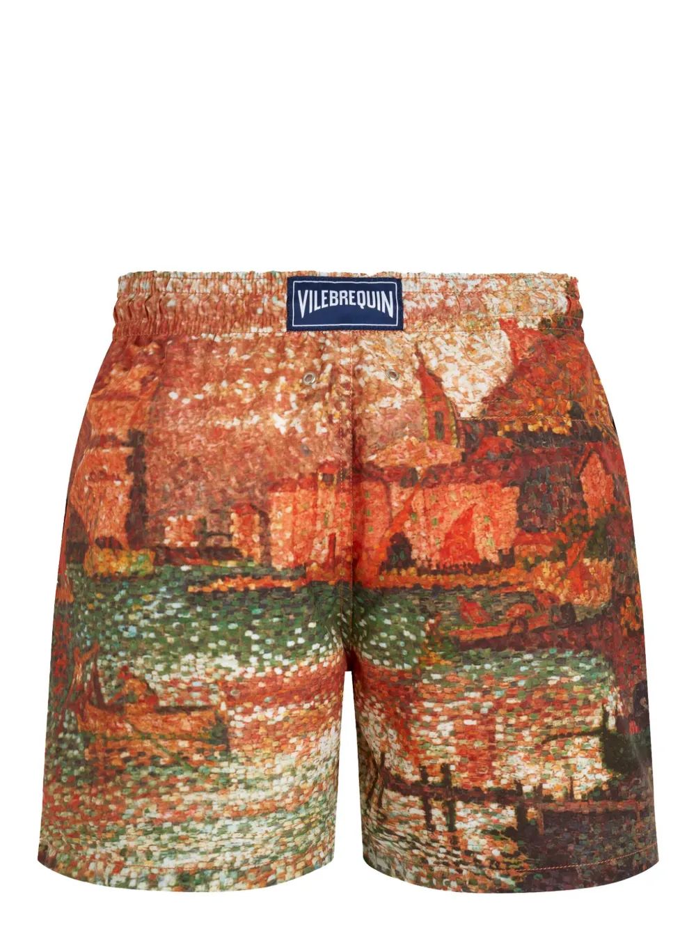 baksteenrood/veelkleurig gerecycled polyamide geschilderde print logo applicatie elastische tailleband met trekkoord twee steekzakken aan de zijkant klepzak aan de achterzijde lengte tot boven de knie Zwemkleding moet over je eigen kleding worden aangepast.