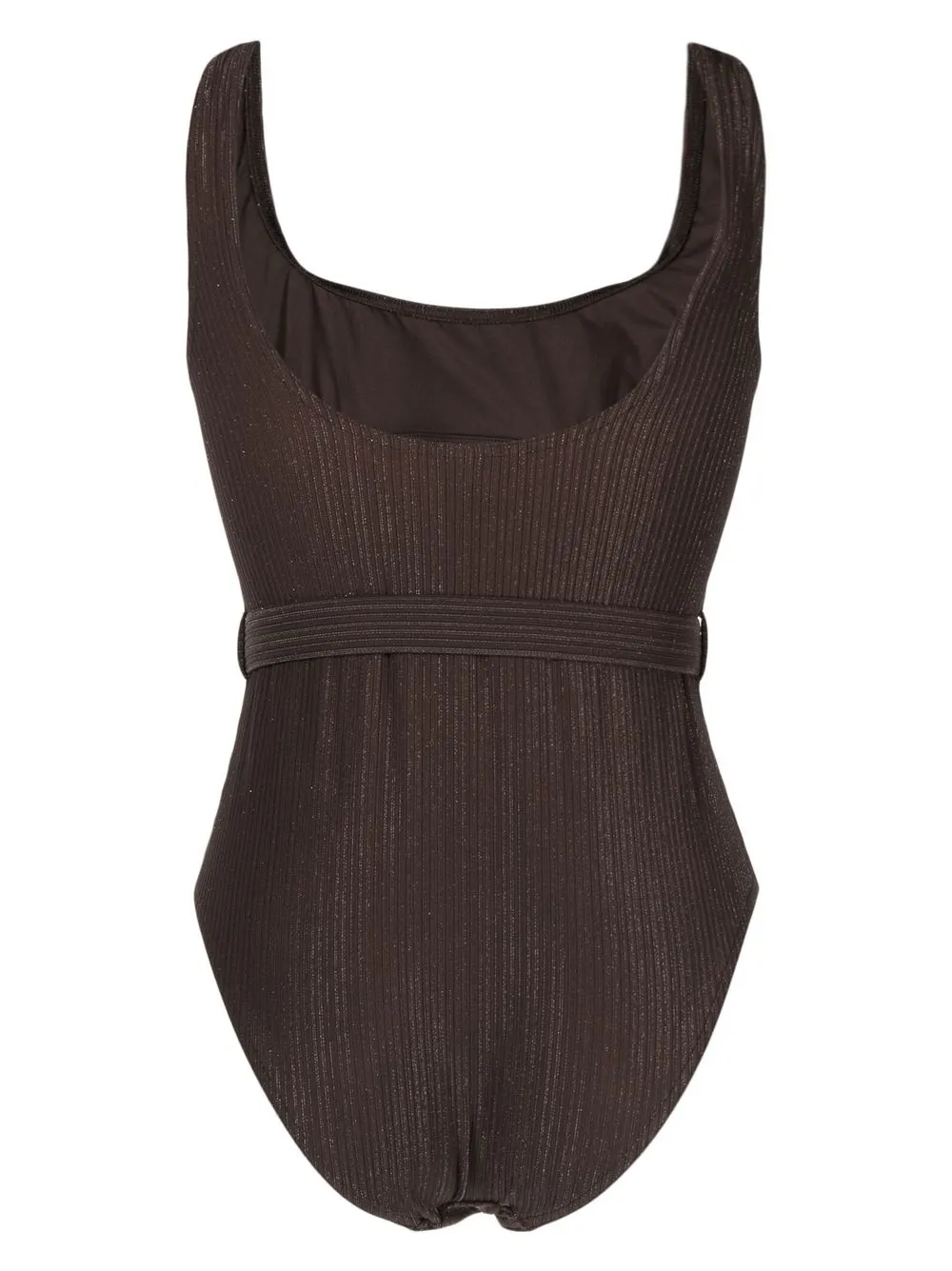 Chocoladebruin, stretch design, fijne ribbels, schildpadschild effect, ronde hals, laag uitgesneden rug, taille met ceintuur en hoog uitgesneden. Zwemkleding moet over je eigen kleding worden aangepast..