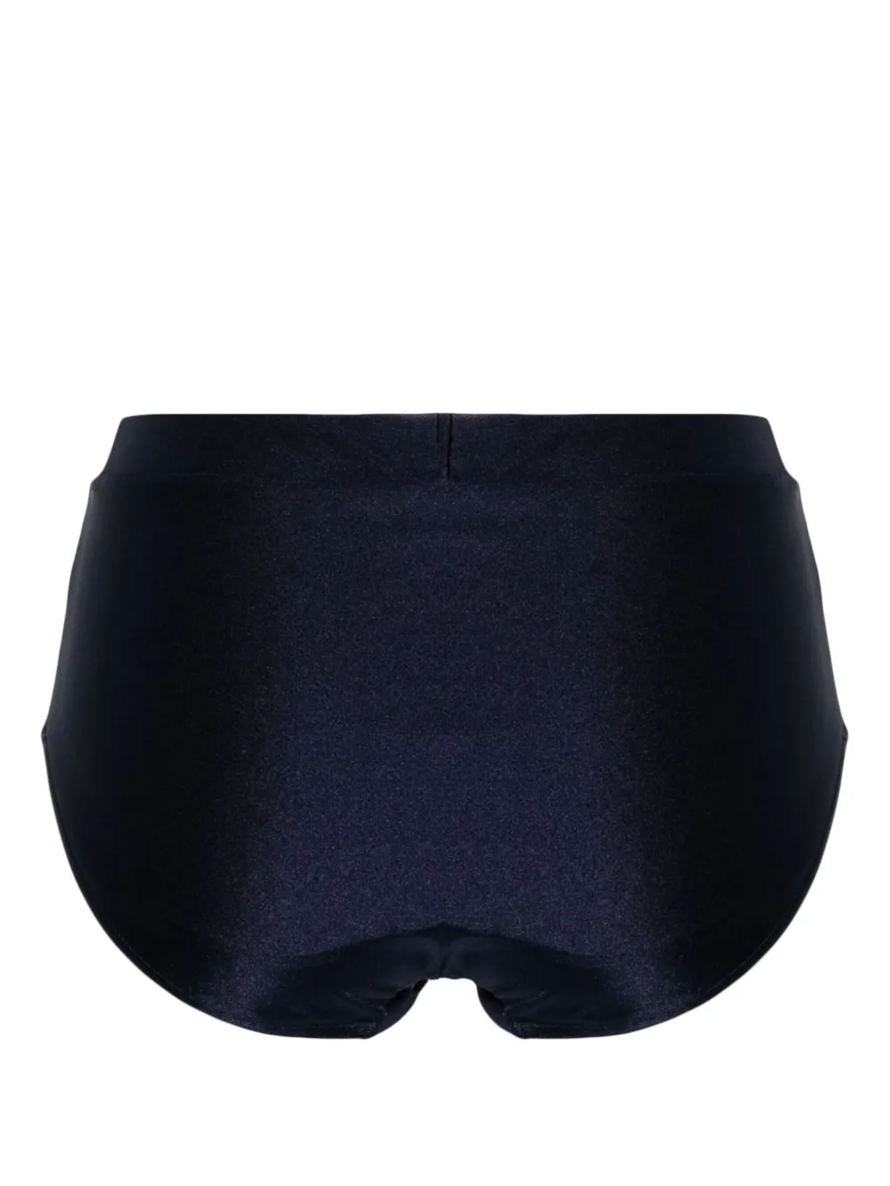 marineblauw stretch design satijnen afwerking metalen ringlets afgewerkt detail high waist elastische tailleband klassieke bikinislip volledige voering goudkleurige hardware Zwemkleding moet over je eigen kleding worden aangepast.