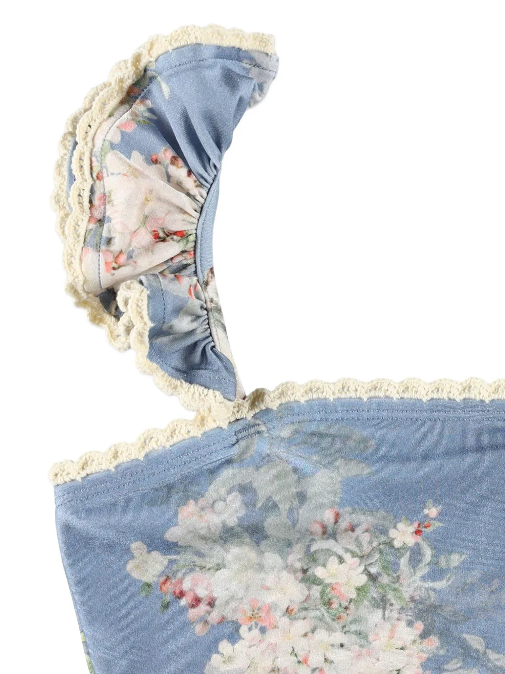 blauw bloemenpatroon schouderbandjes met franje gehaakte details Zwemkleding moet over je eigen kleding worden aangepast.