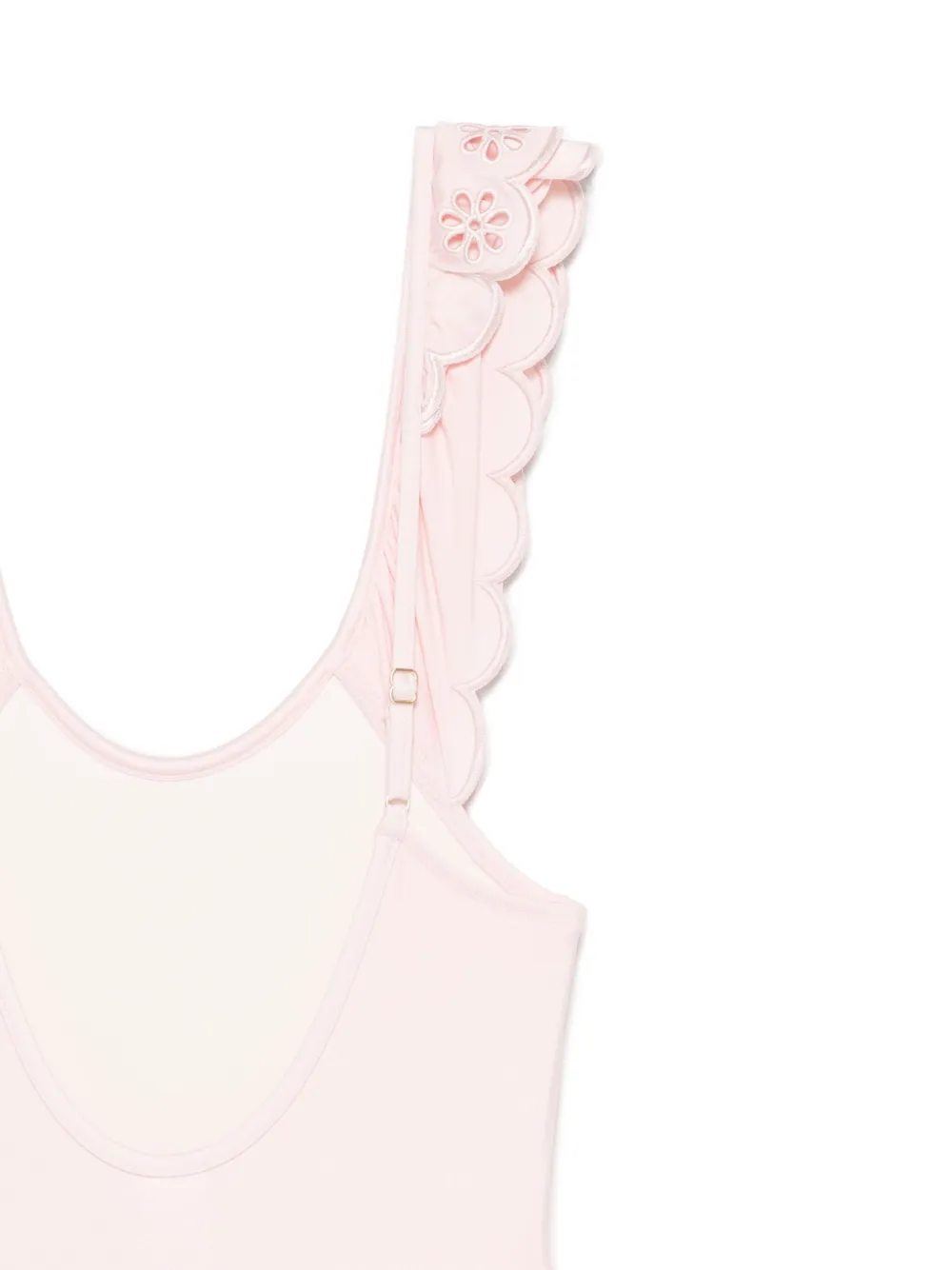 lichtroze diepe ronde hals twee verstelbare schouderbanden laag uitgesneden rug Zwemkleding moet over je eigen kleding worden aangepast.